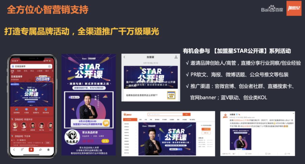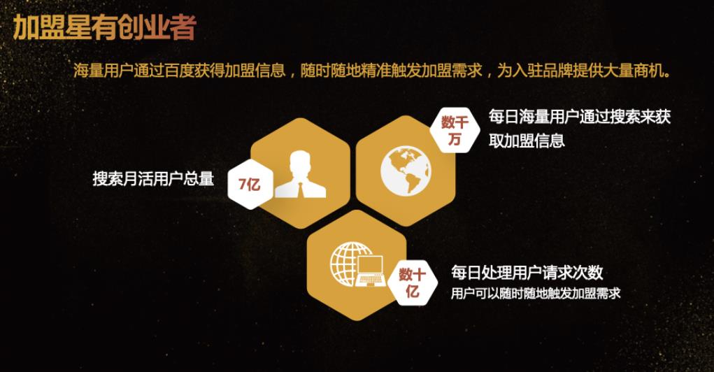 1、加盟星有創業者:海量用戶通過百度獲得加盟信息,隨時隨地精準觸發加盟需求,為入駐品牌方提供大量商機;