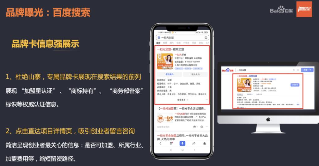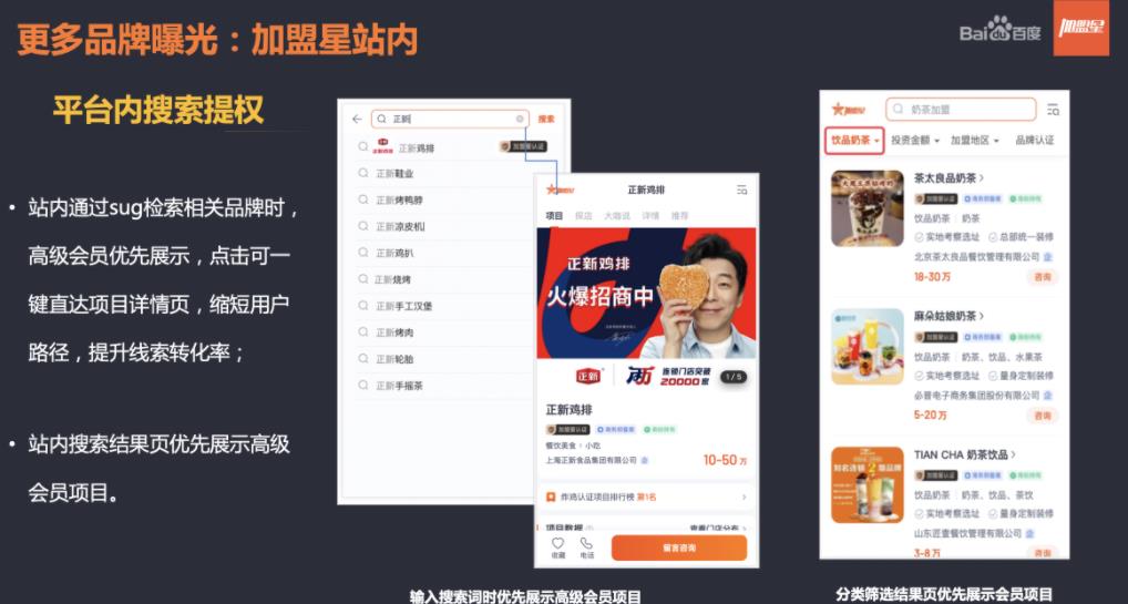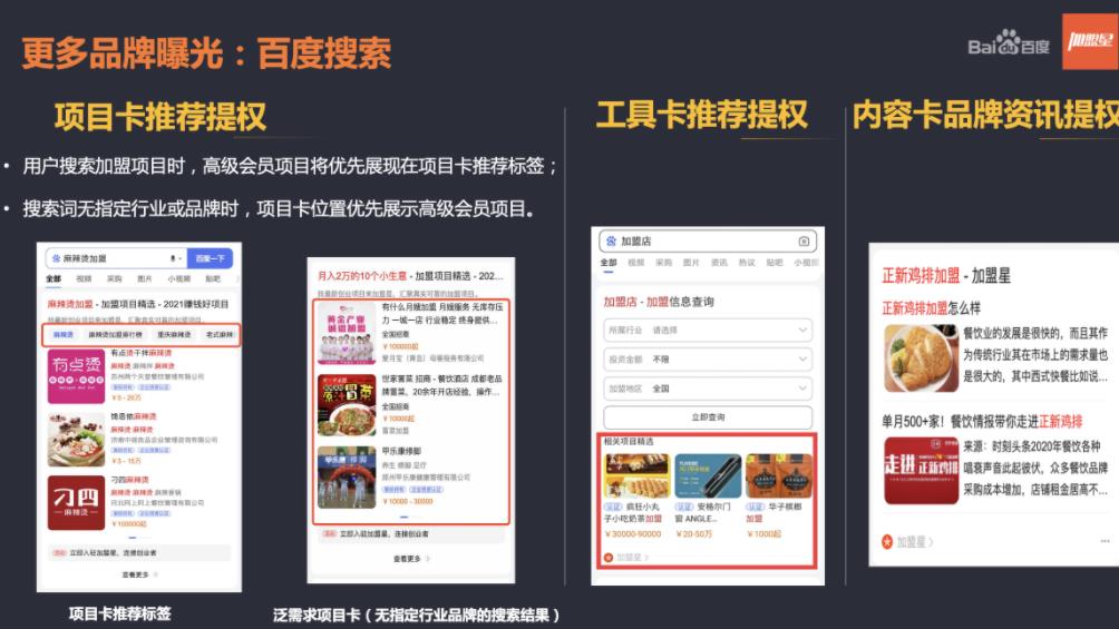 1、超強品牌曝光:多場景搜索流量覆蓋,通過搜索行業詞、品牌詞等多元需求詞為加盟項目及站內導流,獲得海量曝光,快速占領創業者心智;