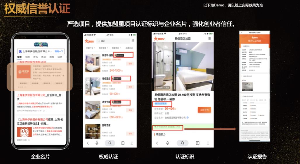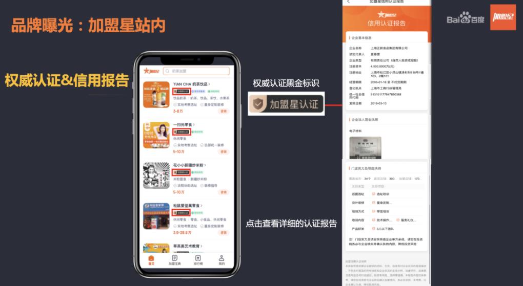 2、權威信譽認證:加盟星對合規項目出具認證報告、授予認證標識,以及額外提供百度搜索企業名片,突顯精選品牌價值,提升用戶認知;