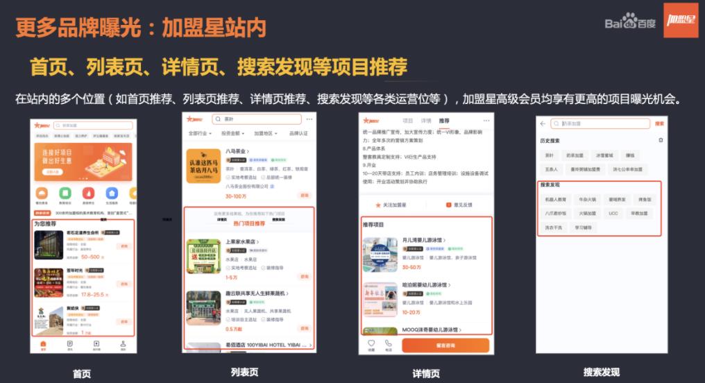 1、加盟星有創業者:海量用戶通過百度獲得加盟信息,隨時隨地精準觸發加盟需求,為入駐品牌提供大量商機;