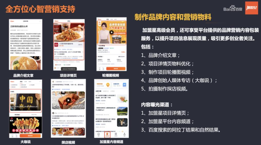 2、全方位心智營銷支持:尊享品牌文章、探店視頻、媒體專訪等精品內容制作服務,建設高質量項目詳情頁,構筑傳播陣地,搶占目標加盟商的心智。