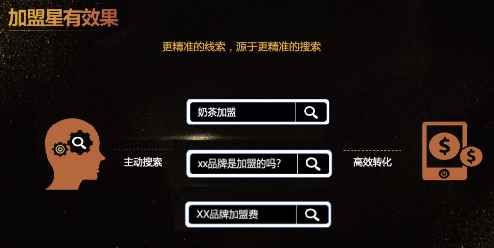 2、加盟星有效果:更精準的線索,源于更精準的搜索,把用戶主動搜索的需求精準、高效轉化為投資線索;