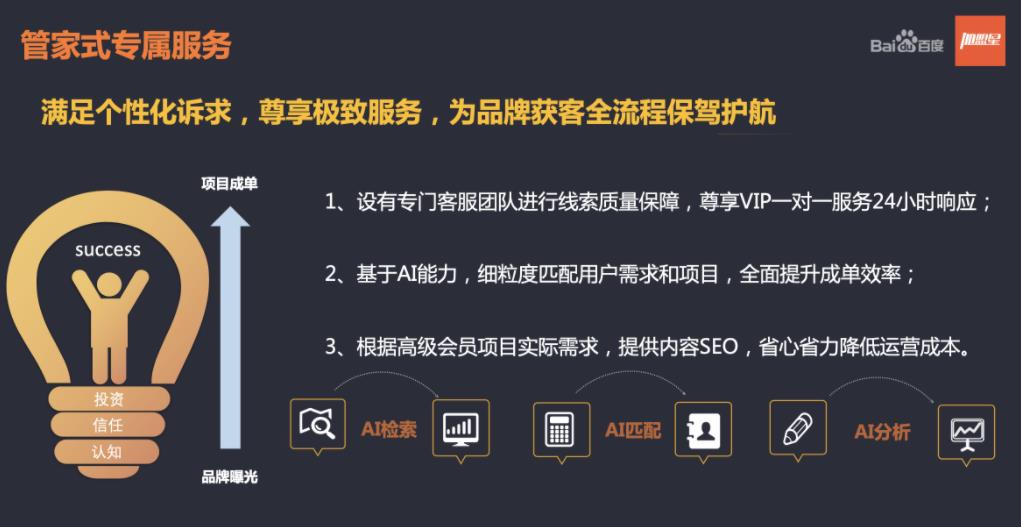 4、精準線索直達:基于百度AI能力精確匹配用戶需求和加盟項目,對投資者線索做真實性驗證,確保項目方第一時間即可獲得精準線索。
