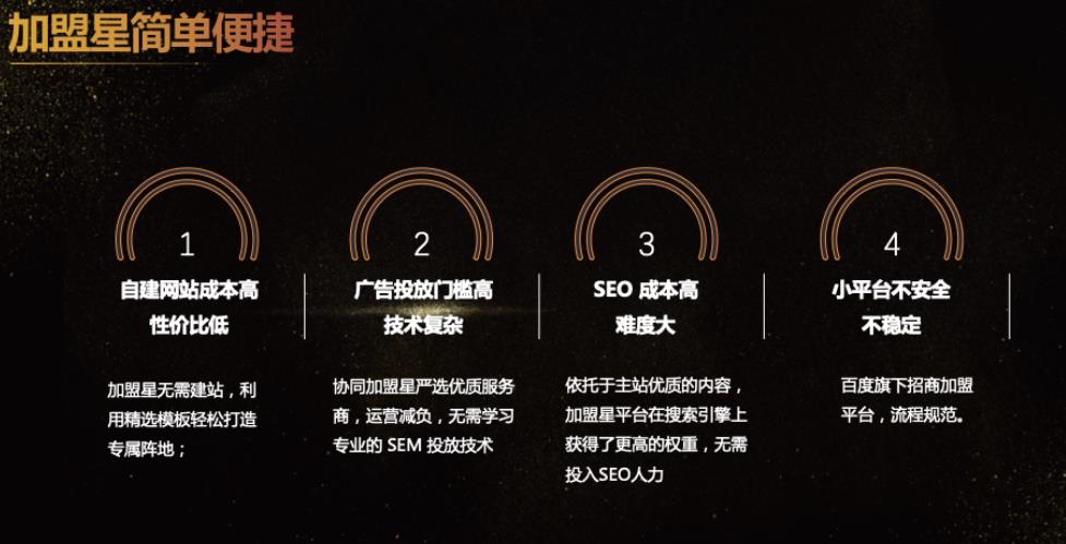 3、加盟星簡單便捷:無需建站,在搜索中即可擁有專屬的營銷陣地;無需學習專業的SEM投放技術,項目優化更簡單。