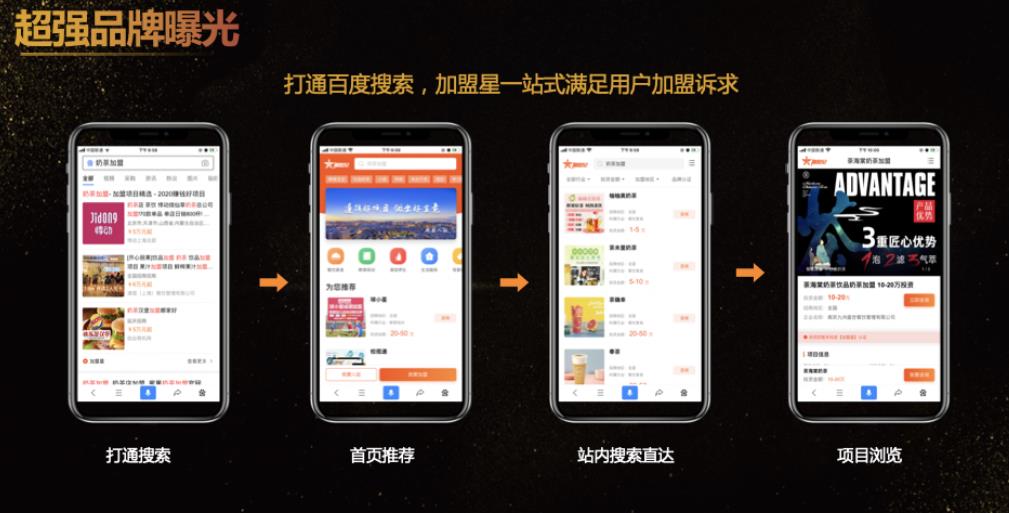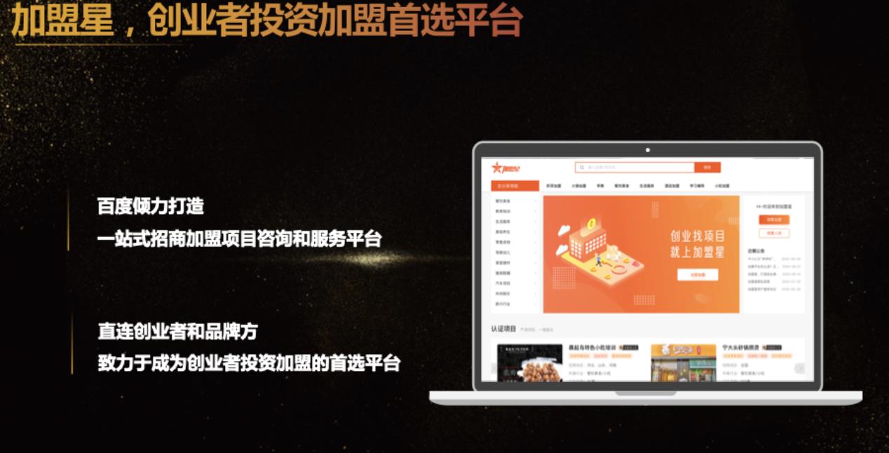 加盟星是百度傾力打造的一站式招商加盟項目咨詢和服務平臺,致力于成為創業者投資加盟的首選平臺。加盟星平臺依托于百度構建的一套權威真實認證體系,匯集加盟商豐富的項目信息,將創業者的海量檢索需求與加盟項目信息精準匹配,幫助創業者更高效地找到理想中的投資項目,降低品牌方獲取線索的成本,提升加盟成單轉化率。