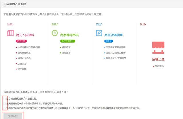 2. 閱讀了解入駐流程,確認入駐須知,然后點擊"立即入駐"繼續申請。