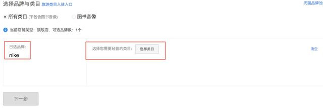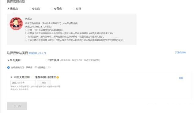 (1)根據自身想要入駐的店鋪類型和品類進行選擇,在填寫商標注冊號之后點擊"下一步"。
