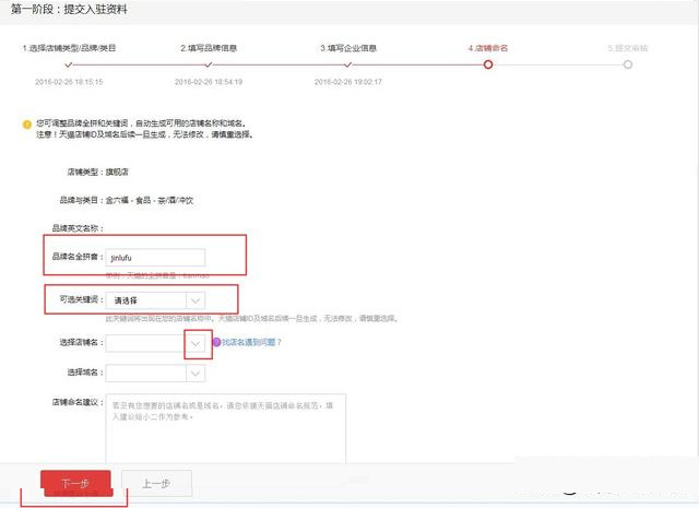 (7) 進行店鋪名稱關鍵詞填寫,并點擊"選擇店鋪名"右側的下拉框選擇店鋪名稱以及店鋪域名,選擇完成后點擊"下一步"。