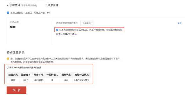 (4) 確認勾選類目的基本入駐要求,點擊"下一步"。