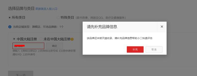 (2) 如果商標未被天貓錄入,則需要商家補充品牌信息,點擊"補充"進入。