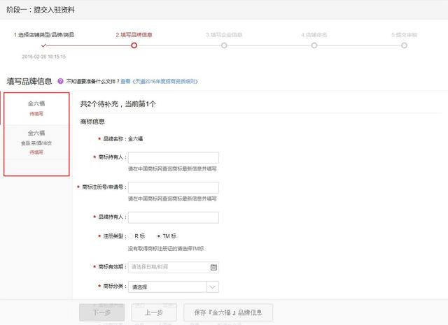(5) 根據實際情況填寫品牌信息,每個選項卡下內容均需填寫完整,每個選項填寫完成后點擊"保存品牌信息",全部完成后點擊"下一步"。